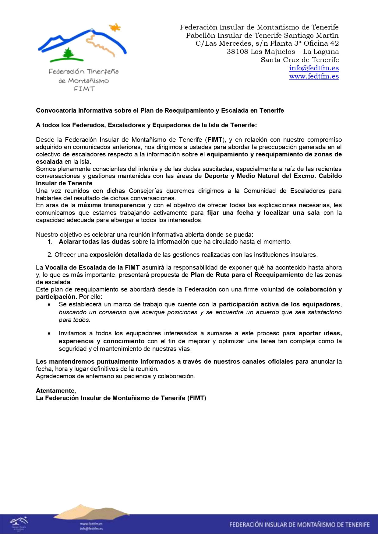 Desde la Federación Insular de Montañismo de Tenerife (FIMT), y en relación con nuestro compromiso adquirido en comunicados anteriores, nos dirigimos a ustedes para abordar la preocupación generada en el colectivo de escaladores respecto a la información sobre el equipamiento y reequipamiento de zonas de escalada en la isla.