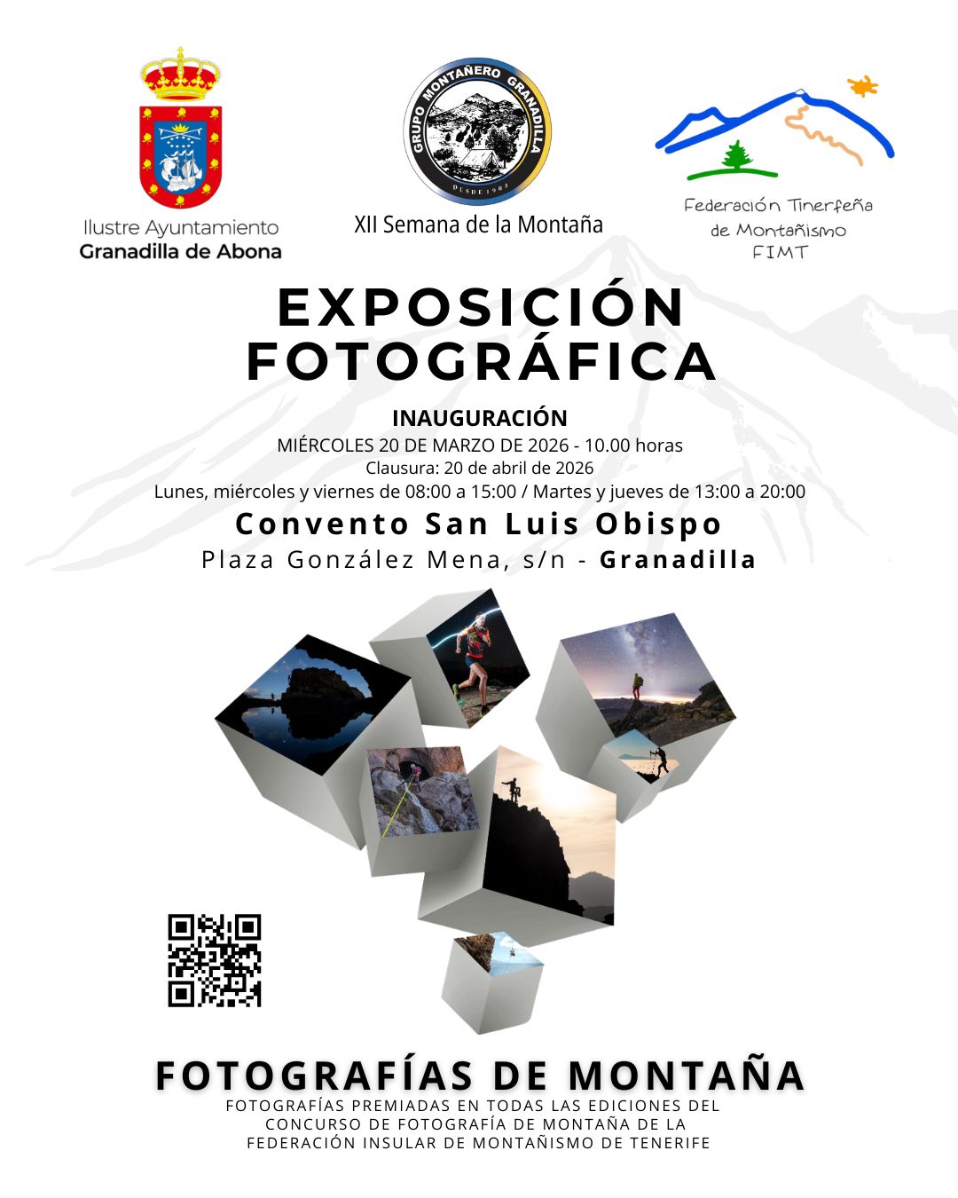 En pasado día 31 de marzo, y dentro de los actos de la VII Semana de la Montaña de Granadilla de Abona, abrió sus puertas al público la Exposición de Fotografías de Montaña de la FIMT en el Convento San Luis Obispo de Granadilla de Abona. La inauguración oficial se realizará el próximo miércoles 8 de abril de 2026, en el mismo Convento San Luis Obispo. Estará abierta al público hasta final del mes de abril.