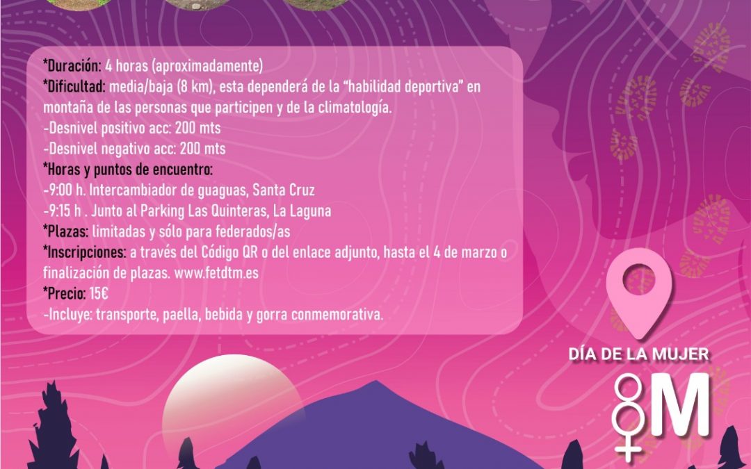 La actividad, exclusivamente para federados y federadas, consistirá en una excursión entre pinar, fayal brezal y laurisilva, en el municipio de Tacoronte, dentro del Paisaje Protegido de Las Lagunetas, concretamente en el Bosque Agua García. Las plazas son limitadas por respeto a la capacidad de carga de los senderos y al Medio Ambiente.